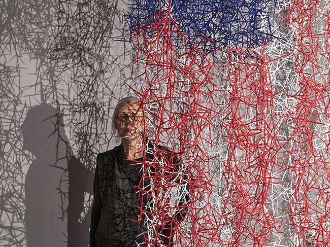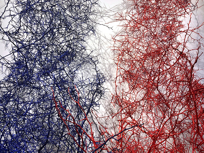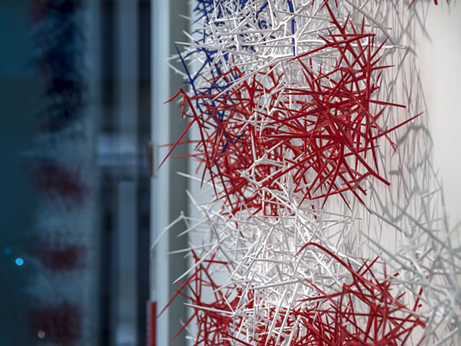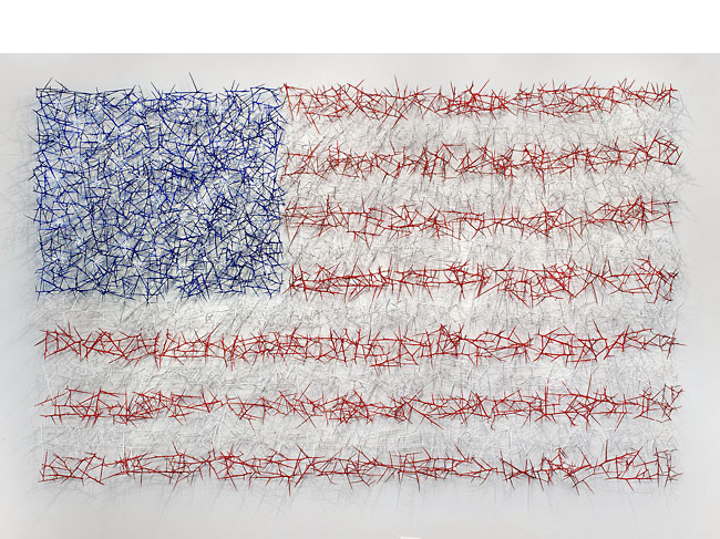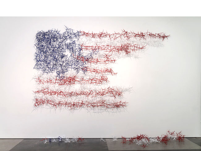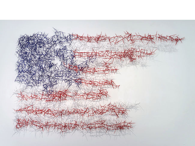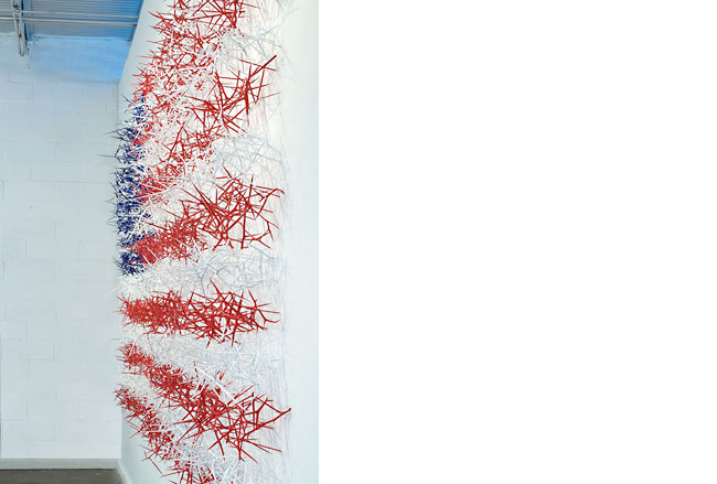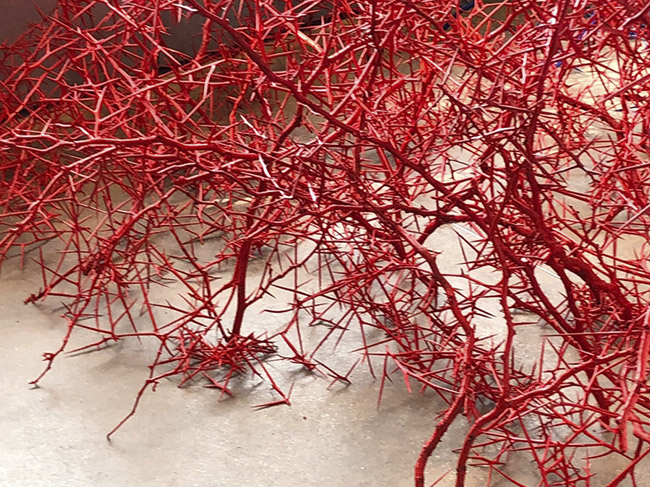 honey locust thorns, wood, acrylic paint 7 1/2' x 12' Haw Contemporary Thoughts on Thorn Works
